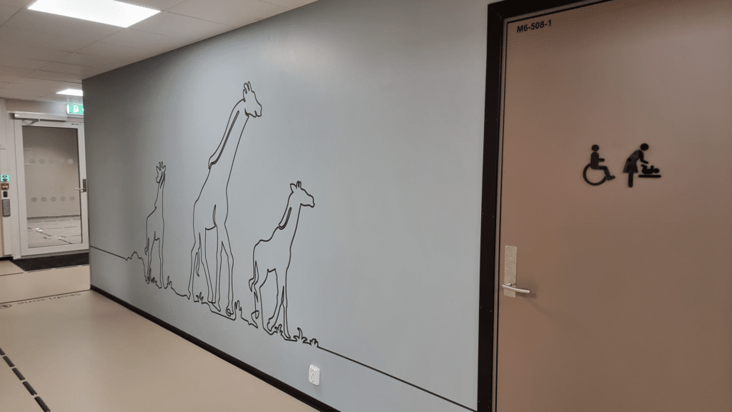 Med lekne og fargerike illustrasjoner har vi bidratt til å skape en lun og positiv atmosfære i gangene.