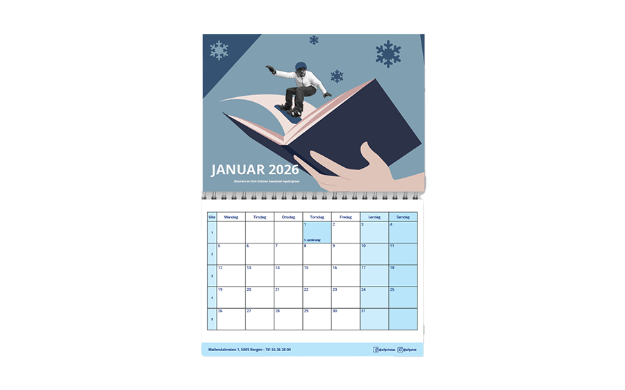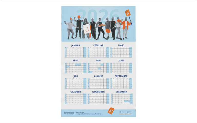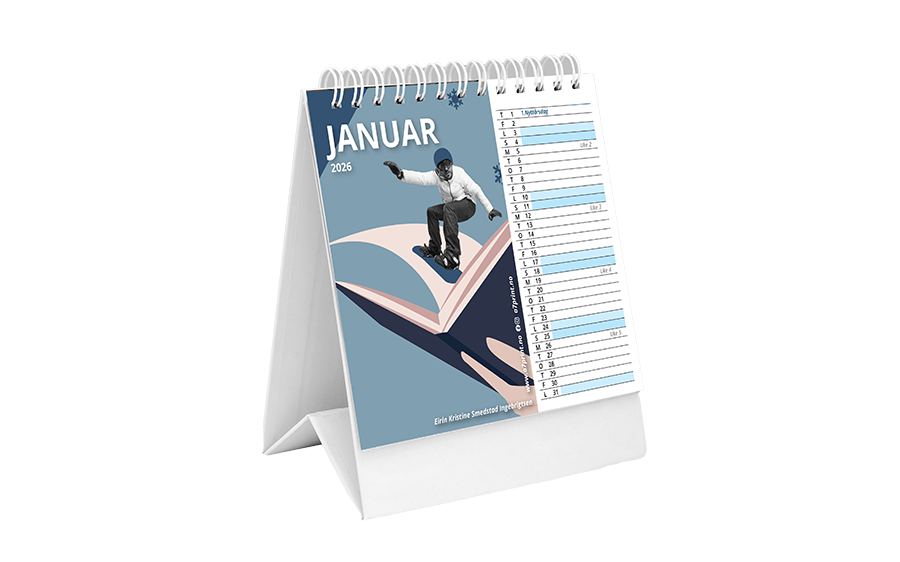 Vi produserer kalendere for både bedrifter og organisasjoner – til intern bruk, gaver eller profilering. Kalenderene kan tilpasses med egen logo, bilder, merkevarefarger og innhold som er relevant for deres virksomhet. Du kan velge blant ulike formater og oppsett – fra veggkalendere til bordkalendere.